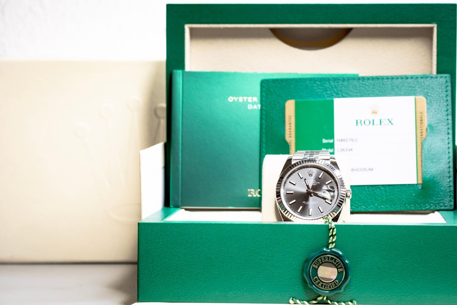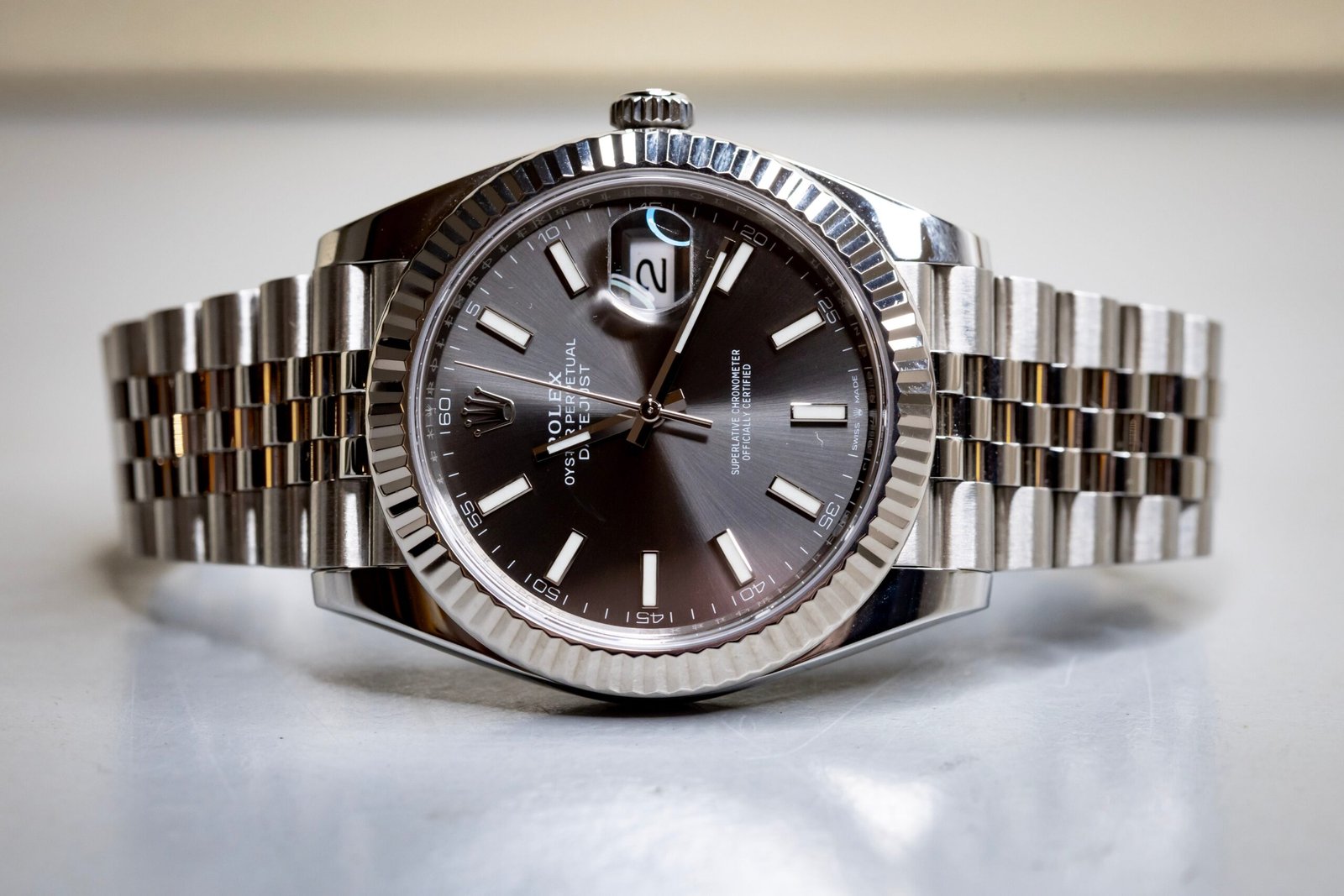 A true modern classic — the Rolex Datejust 41 ref. 126334 with slate dial is one of the most versatile configurations in the lineup. The sunburst slate dial shifts beautifully in different lighting, paired with the signature white gold fluted bezel for that unmistakable Rolex presence.