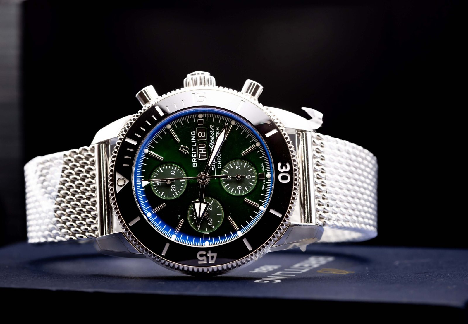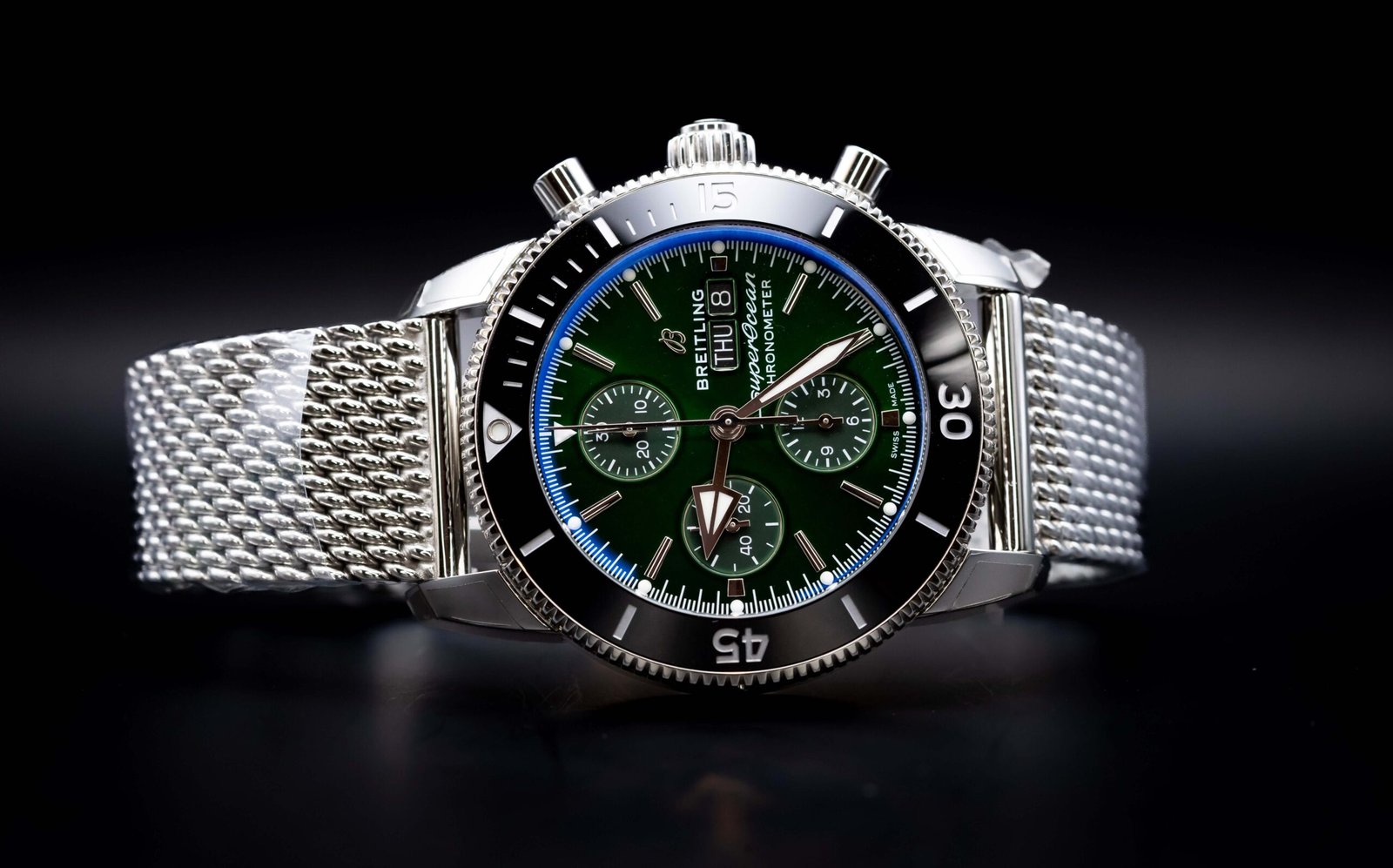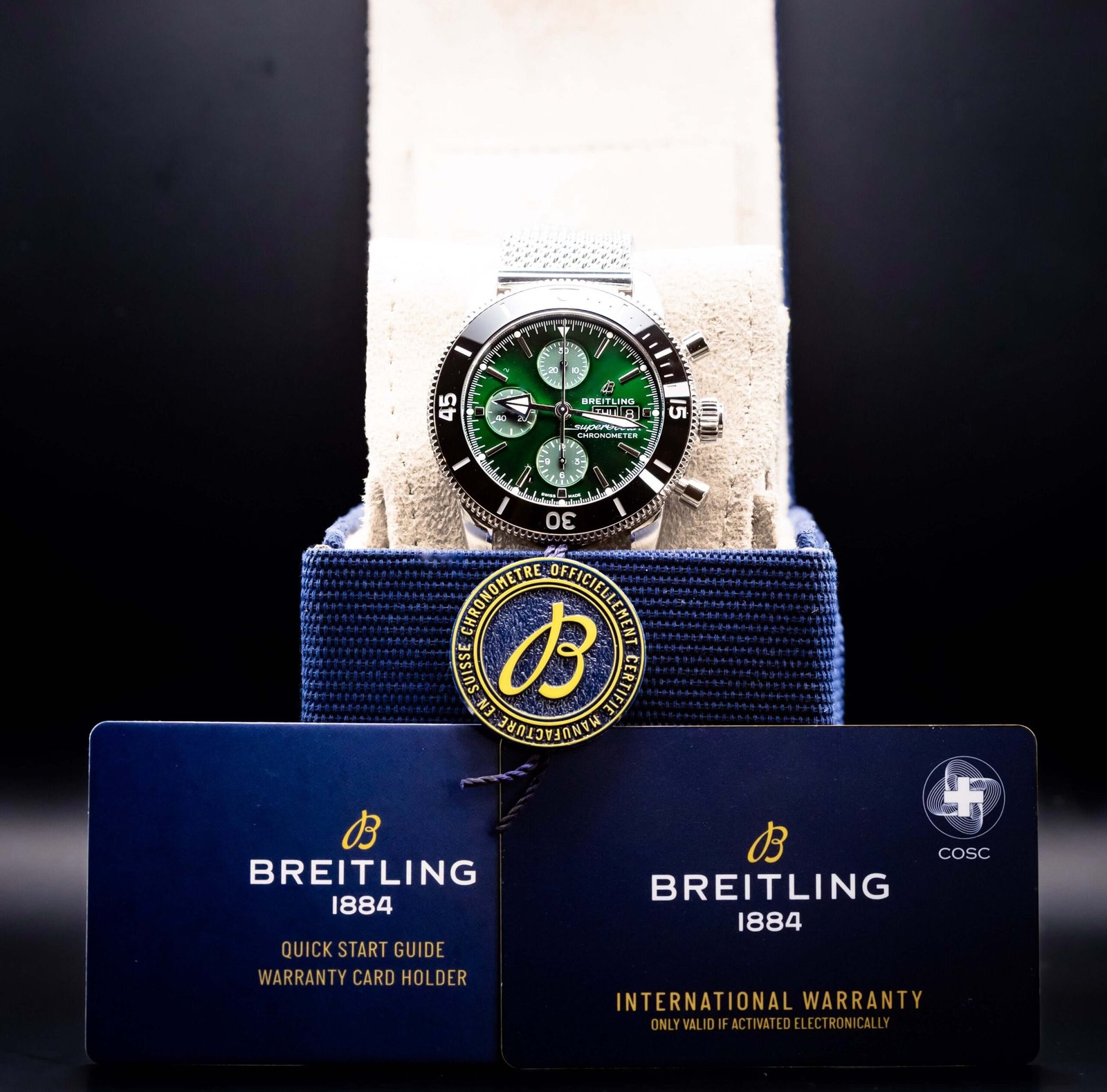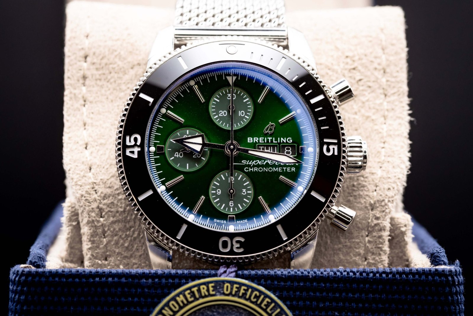 Breitling Superocean Chronograph 44 with green dial. Rugged dive watch with bold presence.