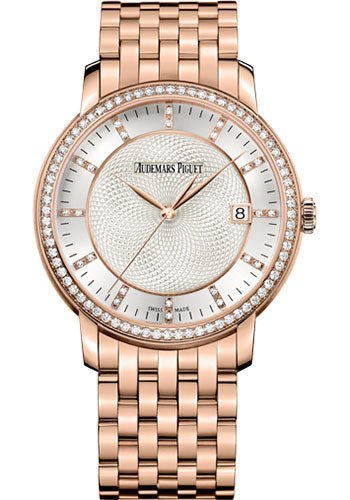 39mm 18K pink gold case, 9.00mm thick, sapphire back, 18K pink gold bezel set with diamonds, sapphire crystal with glare-proof, silver-toned dial with pink gold applied hour-markers and hands, caliber 3120 self-winding movement with hours, minutes, center seconds, date, approximately 60 hours of power reserve, pink gold bracelet, AP folding buckle. Water resistant to 20 meters.