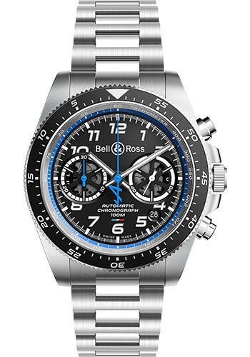 43 mm satin-finished and polished steel case, sapphire back, screw-down crown, bi-directional rotating steel bezel with anodised black aluminium ring and 60-minute countdown scale, domed sapphire crystal with anti-reflective coating, black dial with applique numerals covered with super-luminova, calibre BR-CAL.301 automatic movement with hours, minutes, small seconds at 3 o’clock and date, chronograph, satin-finished and polished steel bracelet, folding buckle. Water resistant to 100 metres.
