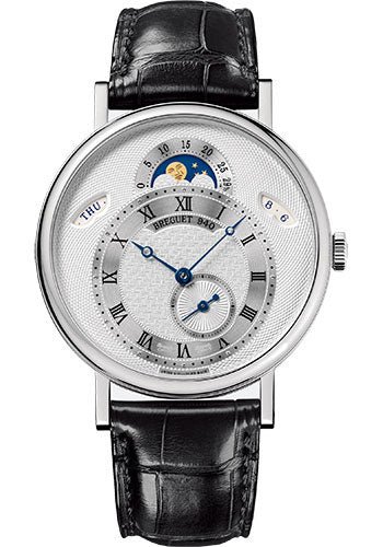 39mm 18K white gold case, 9.90mm thick, transparent back, 18K white gold bezel, scratch resistant sapphire crystal, silver dial with painted roman numeral hour-markers chapter ring, calibre 502.3 QSE1 automatic movement, approximately 45 hours of power reserve, black alligator/crocodile leather strap, deployant buckle. Water resistant to 30 m (99ft).