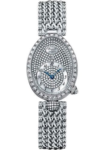 24.95 mm white gold case, 8.50 mm thick, sapphire back, set with a briolette diamond crown, diamond paved dial, calibre 586/1 self-winding movement, approximately 38 hours of power reserve, white gold chain bracelet. Water resistant to 30 meters.