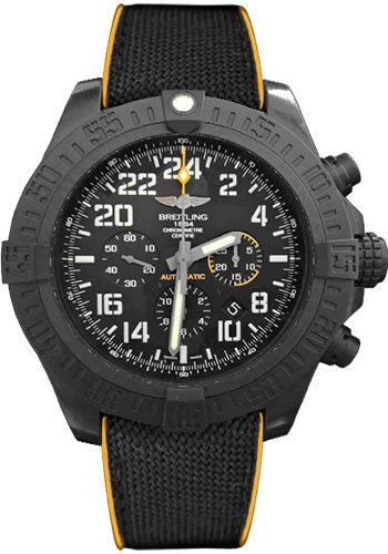 50.00 mm Breitlight case made from a lightweight high-tech polymer that’s been charged with composite fibers for strength and rigidity, screw-locked crown, unidirectional ratcheted bezel, cambered sapphire crystal with glareproof treatment on both sides, Volcano black dial, selfwinding high frequency Breitling B12 movement with date display, chronograph function, 70 hours of power reserve, anthracite yellow military rubber strap with folding buckle. Water resistant to 100 m (330 ft).