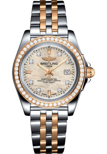 32.00 mm steel and rose gold case, 10.79 mm thick, non screw-locked crown with three gaskets, cambered sapphire crystal with glareproof treatment on both sides, mother-of-pearl diamond dial, Breitling 71 SuperQuartz movement, steel and rose gold bracelet. Water resistant to 100 m (330 ft).