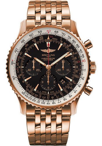 46.00 mm red gold case, 14.50 mm thick, transparent sapphire crystal back, non screw-locked crown with two gaskets, rotating bezel with circular slide rule, cambered sapphire crystal with glareproof treatment on both sides, black/gold dial, Breitling 01 (Manufacture) self-winding movement, approximately 70 hrs of power reserve, red gold bracelet. Water resistant to 3 bars.