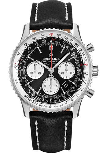 43.00 mm steel case, 14.22 mm thick, transparent sapphire crystal back, non screw-locked crown with two gaskets, bidirectional slide rule bezel, cambered sapphire crystal with glareproof treatment on both sides, black dial, Breitling 01 (Manufacture) self-winding movement, approximately 70 hrs of power reserve, black leather strap, folding buckle. Water resistant to 3 bars.