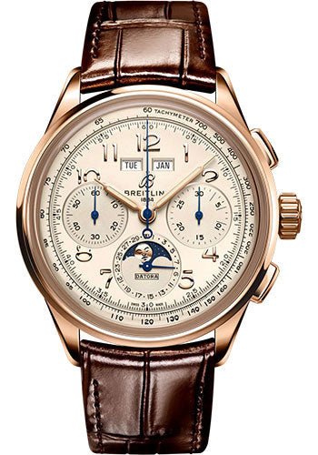 42.0 mm 18K red gold case, 15.3 mm thick, transparent sapphire crystal back, non screw-locked crown with two gaskets, fixed bezel, silver dial, Breitling B25 (Manufacture) self-winding movement, approximately approx. 48 hrs of power reserve, brown alligator leather strap, folding buckle. Water resistant to 100 m (330 ft).