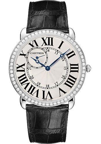 Extra large size (42mm) 18K white gold case set with round diamonds, circular-grained crown with set with a diamond, silvered flinque dial with 12 black Roman numerals, 10 black Arabic numerals, small seconds at 10 o’clock, manual winding caliber 9754 MC movement, alligator strap with 18K white gold deployant buckle. Water resistant to 30 meters.