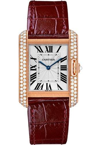 34.7mm x 26.2mm 18K pink gold case set with brilliant-cut diamonds, 7.1mm thick, 9-sided crown set with a brilliant-cut diamond, 18K pink gold bezel set with a brilliant-cut diamonds, silver dial set with brilliant-cut diamonds, quartz movement with blued-steel sword-shaped hands, shiny bordeaux alligator skin strap. Water resistant to 3 bar.