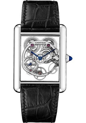 30mm x 39.2mm 18K white gold case, 7.45mm thick, sapphire back, beaded 18K pink gold crown set with a blue sapphire cabochon, 18K pink gold case bezel, sapphire crystal, skeleton dial, caliber 9616 MC manual-winding movement with blued-steel sword-shaped hands, approximately 3 days of power reserve, black alligator skin strap, double adjustable folding buckle. Water resistant to 3 bar.
