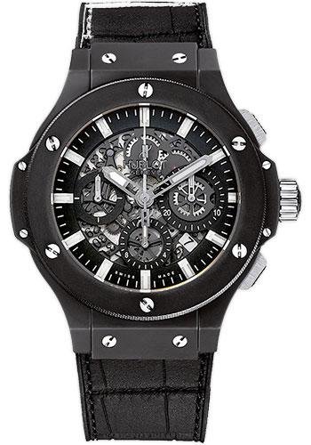 44mm black ceramic case, black ceramic bezel, black composite resin lateral inserts and bezel lugs, black dial, self winding HUB 4124 movement with skeleton chronograph function, approximately 42 hours of power reserve, black rubber and gummy alligator strap. Water resistant to 100 meters.