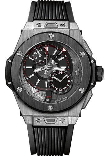 45 mm polished and satin-finished titanium case, polished and satin-finished black ceramic bezel, black composite resin lower bezel with 6 H-shaped titanium screws, sapphire crystal with anti-reflective treatment, multilayered sapphire and mat black dial with satin-finished rhodium-plated appliques, satin-finished and microblassted rhodium-plated hands, white luminescent on appliques and hands, HUB5003 manual-winding movement with alarm and GMT functions, approximately 72 hours of power reserve, black structured lined rubber strap, titanium deployant buckle with black ceramic insert. Water resistant to 100 meters.