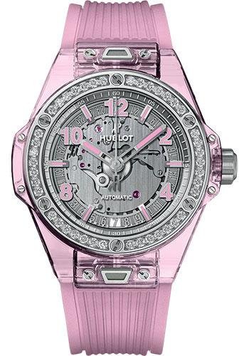39 mm polished pink sapphire crystal case, polished stainless steel bezel set with 42 diamonds (1.00ct) and 6 H-shaped titanium screws, sapphire crystal with anti-reflective treatment, sapphire crystal dial, HUB1710 self-winding movement, approximately 50 hours of power reserve, pink structured lined rubber strap, stainless steel deployant buckle. Water resistant to 50 meters.