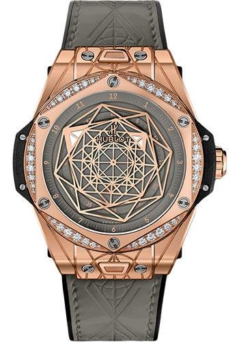 39 mm engraved polished 18k king gold case, polished 18K king gold bezel set with 48 diamonds, 6 H-shaped titanium screws, black composite resin lower bezel, sapphire crystal with anti-reflective treatment, satin-finished grey dial, HUB1710 self-winding movement, approximately 50 hours of power reserve, black rubber and grey shiny calf strap, 18K king gold and black-plated stainless steel deployant buckle. Water resistant to 100m (10 ATM).