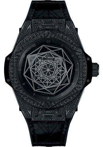 39 mm polished black-plated case set with 180 black diamonds (0.45ct) and with engraved design by Maxime Buchi, polished black-plated bezel set with 96 black diamonds (1.00ct) with 6 H-shaped black-plated titanium screws and hexagonal decor designed by Maxime Buchi, sapphire crystal with anti-reflective treatment, mat and satin-finished black dial, HUB1710 self-winding movement, approximately 50 hours of power reserve, black rubber and shiny calf embossed design by Maxime Buchi strap, black-plated stainless steel deployant buckle. Water resistant to 100 meters.