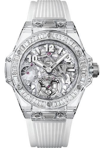 45 mm polished sapphire crystal case, polished sapphire crystal bezel with 48 baguette-cut diamonds (~2.80cts) and 6 H-shaped titanium screws, sapphire crystal with anti-reflective treatment, sapphire crystal dial, HUB6016 manual-winding skeleton toubillon movement, approximately 115 hours of power reserve, transparent structured lined rubber strap, titanium deployant buckle. Water resistant to 30 meters.