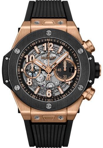 44 mm polished and satin-finished 18k king gold case, satin-finished and polished black ceramic bezel with 6 h-shaped titanium screws, sapphire crystal with anti-reflective treatment, matte black skeleton dial, HUB1280 UNICO manufacture self-winding chronograph flyback movement, approximately 72 hours of power reserve, black structured lined rubber strap, 18K king gold and black pvd titanium deployant buckle. Water resistant to 100m (10 ATM).