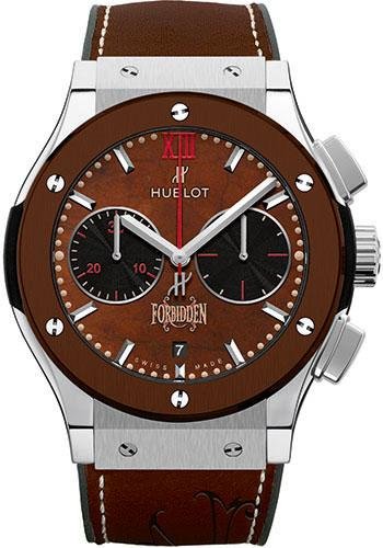 45mm polished and satin-finished titanium case Forbidden X logo engraved solid back,, brown ceramic bezel with 6 H-shaped titanium screws, sapphire crystal with interior and exterior anti-reflective treatment, real tobacco leaf dial with black counters, red chronograph hand, ForbiddenX logo at 12 o’clock, self winding HUB 1143 movement with chronograph function, approximately 42 hours of power reserve, tobacco-colored calfskin sewn onto black rubber strap with beige stitching and Forbidden X, deployant steel buckle. Water resistant to 50 meters.