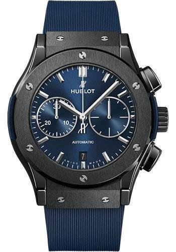 45 mm polished and satin-finished black ceramic case, satin-finished and polished black ceramic bezel with 6 h-shaped titanium screws, sapphire crystal with anti-reflective treatment, satin-finished blue sunray dial, HUB1143 self-winding chronograph movement, approximately 42 hours of power reserve, blue lined rubber strap, black-plated stainless steel deployant buckle. Water resistant to 50m (5 ATM).