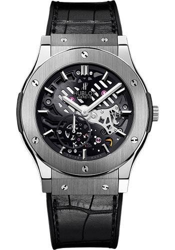 45mm titanium case, titanium bezel vertical satin finish, sapphire dial with silvered Hublot logo transfer, hand-wound skeleton HUB 1300 movement with small seconds at 7 o’clock, approximately 90 hours of power reserve, black alligator and rubber strap with deployant buckle. Water resistant to 50 meters.