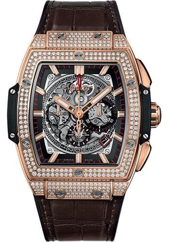 45 mm polished 18k king gold case set with 168 diamonds for 1.12cts, polished 18K king gold bezel set with 156 diamonds for 1.34cts with, 6 H-shaped titanium screws, sapphire crystal with anti-reflective treatment, sapphire dial, HUB4700 self-winding skeleton chronograph movement, approximately 50 hours of power reserve, black rubber and brown alligator strap, 18K king gold and black-plated titanium deployant buckle. Water resistant to 100m (10 ATM).