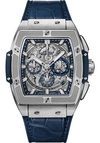 42 mm satin-finished and polished titanium case, satin-finished, polished and microblasted titanium bezel with 6 h-shaped titanium screws, sapphire crystal with anti-reflective treatment, sapphire dial, HUB4700 self-winding skeleton chronograph movement, approximately 50 hours of power reserve, blue rubber and alligator leather strap, titanium and black-plated titanium deployant buckle. Water resistant to 100m (10 ATM).