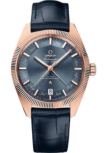 41 mm 18K Sedna gold case, transparent back, fluted bezel, domed scratch-resistant sapphire crystal with anti-reflective treatment on both sides, sun-brushed blue dial with Pie Pan design, caliber 8923 self-winding Co-Axial master chronometer movement with date and annual calendar functions, approximately 55 hours of power reserve, blue leather strap. Water resistant to 100 m (330 ft).