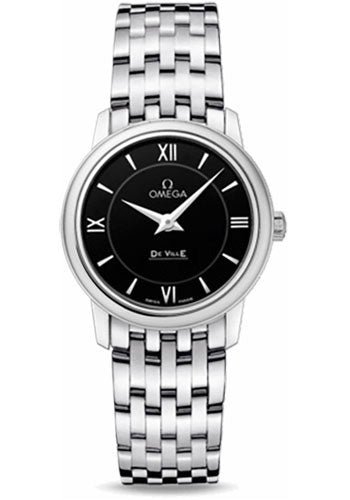 27.4 mm stainless steel case, scratch-resistant sapphire crystal, black dial, quartz Omega 1376 movement, approximately 41 months of power reserve, stainless steel bracelet. Water resistant to 30 m.