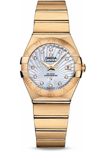 27 mm brushed 18K yellow gold case, transparent back, domed scratch-resistant sapphire crystal with anti-reflective treatment both sides, white mother-of-pearl supernova dial with diamond hour markers, self-winding chronometer Omega 8520 movement with Co-Axial Escapement, date, and seconds, approximately 50 hours of power reserve, 18K yellow gold bracelet. Water resistant to 100 m.