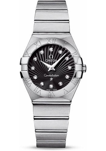 27 mm brushed stainless steel case, domed scratch-resistant sapphire crystal with anti-reflective treatment inside, black shell dial, quartz Omega 1376 movement, approximately 32 months of power reserve, stainless steel bracelet. Water resistant to 100 m.