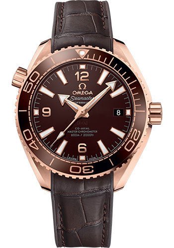 39.5 mm 18K Sedna gold case with helium escape valve, transparent screw-in back, screw-in crown, unidirectional rotating brown cermaic bezel with Ceragold diving scale, domed scratch-resistant sapphire crystal with anti-reflective treatment on both sides, chocolate brown dial with Arabic numerals and a date window at the 3 o’clock, caliber 8801 self-winding Co-Axial chronometer movement with date function, approximately 55 hours of power reserve, brown leather strap with rubber lining. Water resistant to 600 m (2000 ft).