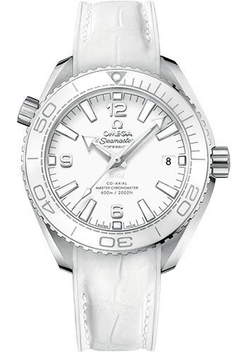 39.5 mm stainless steel case with helium escape valve, transparent screw-in back, screw-in crown, unidirectional rotating white cermaic bezel with Ceragold diving scale, domed scratch-resistant sapphire crystal with anti-reflective treatment on both sides, white dial with Arabic numerals and a date window at the 3 o’clock, caliber 8800 self-winding Co-Axial chronometer movement with date function, approximately 55 hours of power reserve, white leather strap with rubber lining. Water resistant to 600 m (2000 ft).