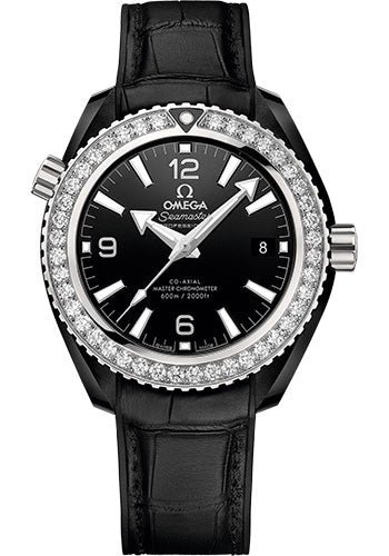 39.5 mm black ceramic case with helium escape valve, transparent back, unidirectional rotating bezel that includes a black ceramic triangle at 12 o’clock, domed scratch-resistant sapphire crystal anti-reflective treatment on both sides, black ceramic dial with 18K white gold numerals, indexes and hands, as well as a date window at 3 o’clock, Caliber Omega 8800 self winding movement with co-axial escapement, chronometer, date, approximately 55 hours of power reserve, black leather strap. Water resistant to 60 bar (600 metres / 2000 feet).