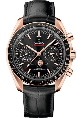 44.25 mm 18K Sedna gold case with anti-magnetic properties, transparent back, 18K Sedna gold bezel with black ceramic ring and Ceragold tachymeter scale, scratch-resistant sapphire crystal with anti-reflective treatment on both sides, black sun-brushed dial with diamond polished 18K Sedna gold indexes and hands, caliber 9905 self-winding Co-Axial master chronometer movement with chronograph and moonphase indication, approximately 60 hours of power reserve, black leather strap, polished-brushed foldover buckle. Water resistant to 100 m (330 ft).