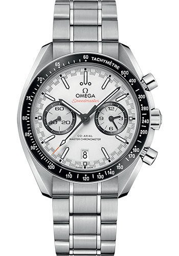 44.25 mm stainless steel case with antimagnetic design, transparent back, black ceramic bezel with tachymeter scale in white enamel, domed scratch-resistant sapphire crystal with anti-reflective treatment on both sides, white dial with racing style minute-track, caliber 9900 self-winding Co-Axial master chronometer movement with chronograph and date functions, approximately 60 hours of power reserve, stainless steel bracelet. Water resistant to 50 m (167 ft).