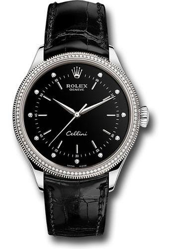 39mm 18K white gold case, flared screw-down crown with Rolex emblem, bezel set with 96 diamonds, domed sapphire crystal, black dial, 18K white gold diamond set hour markers, Rolex calibre 3132 self-winding movement, approximately 48 hours of power reserve, shiny black alligator leather strap, 18K white gold buckle. Waterproof to 50 meters.