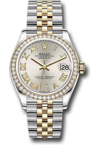 31mm yellow Rolesor case comprised of Oystersteel and 18K yellow gold, screw-down back, screw-down crown with twinlock double waterproofness system, 18K yellow gold bezel set with diamonds, scratch-resistant sapphire crystal with cyclops lens over the date, silver dial, Roman numerals with 11 diamonds set on VI, Rolex calibre 2236 perpetual self-winding movement with date at 3 o’clock, approximately 55 hours of power reserve, yellow Rolesor Jubilee bracelet with semi-circular three-piece links, concealed folding Crownclasp buckle. Waterproof to 100 meters. Baselworld 2019 release.