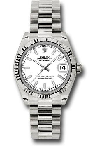 31mm 18K white gold case, screw-down crown with twinlock double waterproofness system, fluted bezel, scratch-resistant sapphire crystal with cyclops lens over the date, white dial, index hour markers, Rolex calibre 2235 automatic movement, President bracelet with semi-circular three-piece links, concealed folding Crownclasp buckle. Waterproof to 100 meters.
