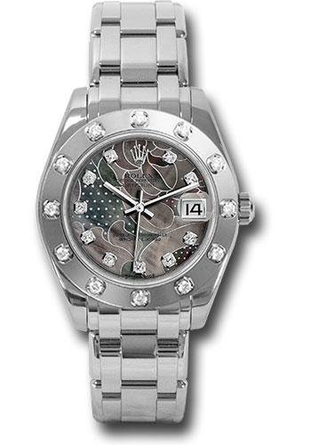 34mm 18K white gold case, screw-down crown, polished bezel set with 12 diamonds, scratch-resistant sapphire crystal with cyclops lens over the date, goldust dream dial, 10 diamond hour markers, Rolex calibre 2235 automatic movement, 18K white gold Pearlmaster bracelet with rounded five-piece links, concealed folding Crownclasp buckle. Water resistant to 100 meters.