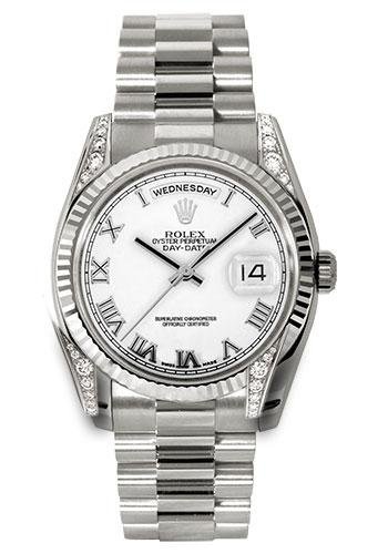 36mm 18K white gold case, case lugs set with 32 diamonds, fluted bezel, white dial, Roman numerals, and President bracelet.