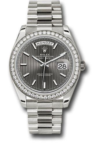 40mm 18K white gold case, screw-down back with Rolex fluting, screw-down crown with twinlock double waterproofness system, bezel set with 48 diamonds, scratch-resistant double anti-reflective sapphire crystal with cyclops lens over the date, dark rhodium stripe motif dial, index hour markers with Chromalight, Rolex calibre 3255 automatic movement with centre hour, minute and seconds hands, instantaneous day and date in apertures, unrestricted rapid-setting, and stop-seconds for precise time setting, approximately 70 hours of power reserve, President bracelet with three-piece solid links comprised of a polished center link, satin-finished outer links, and ceramic inserts, concealed folding Crownclasp buckle. Waterproof to 100 meters.