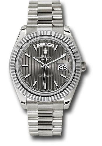 Rolex White Gold Day-Date 40 Watch – Fluted Bezel – Dark Rhodium Stripe Motif Index Dial – President Bracelet – 228239 rsmip