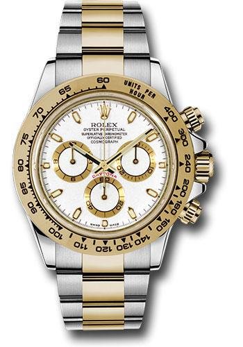 40mm Yellow Rolesor case with 904L steel monobloc middle case, screw-down steel back, screw-down crown and push buttons with Triplock triple waterproofness, fixed 18K yellow gold bezel with engraved tachymetric scale, scratch-resistant sapphire crystal, white dial, index hour markers, Rolex calibre 4130 self-winding movement with chronograph central second hand, 30-minute counter at 3 o’clock, and 12-hour counter at 9 o’clock, approximately 72 hours of power reserve, 18K yellow gold Oyster bracelet with flat three-piece links made from a combination of 904L steel and 18K yellow gold, folding Oysterlock buckle with Easylink 5mm comfort extension link. Waterproof to 100 meters.