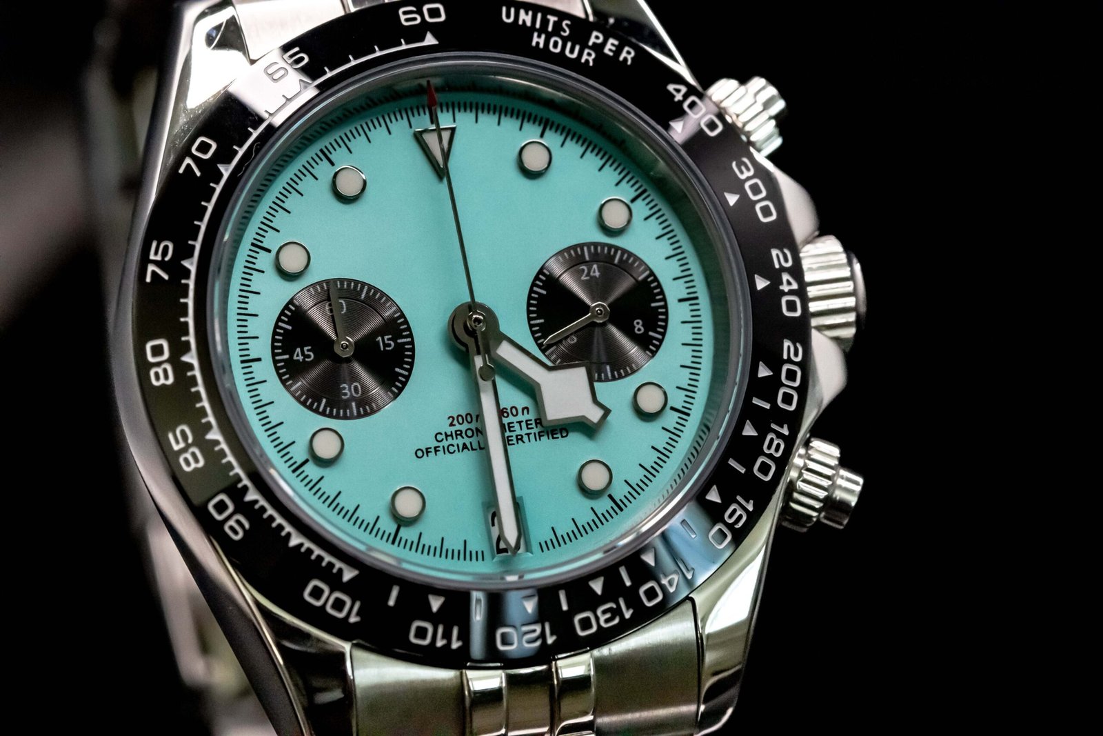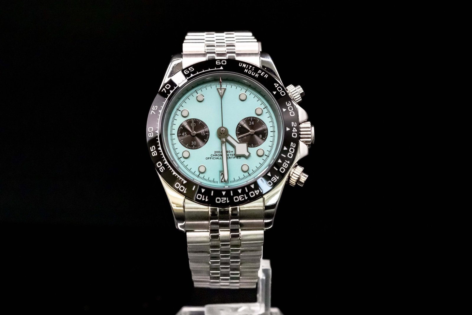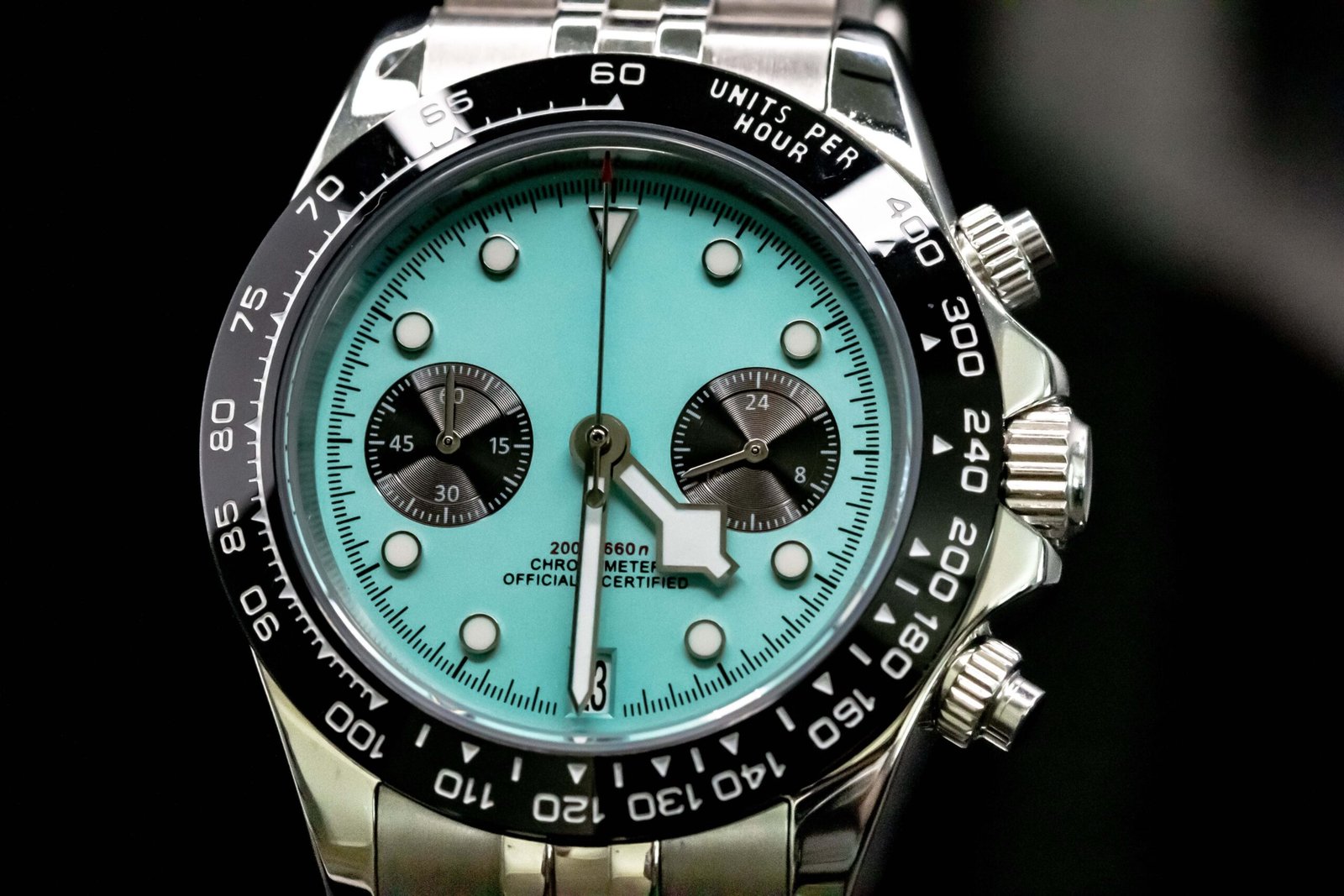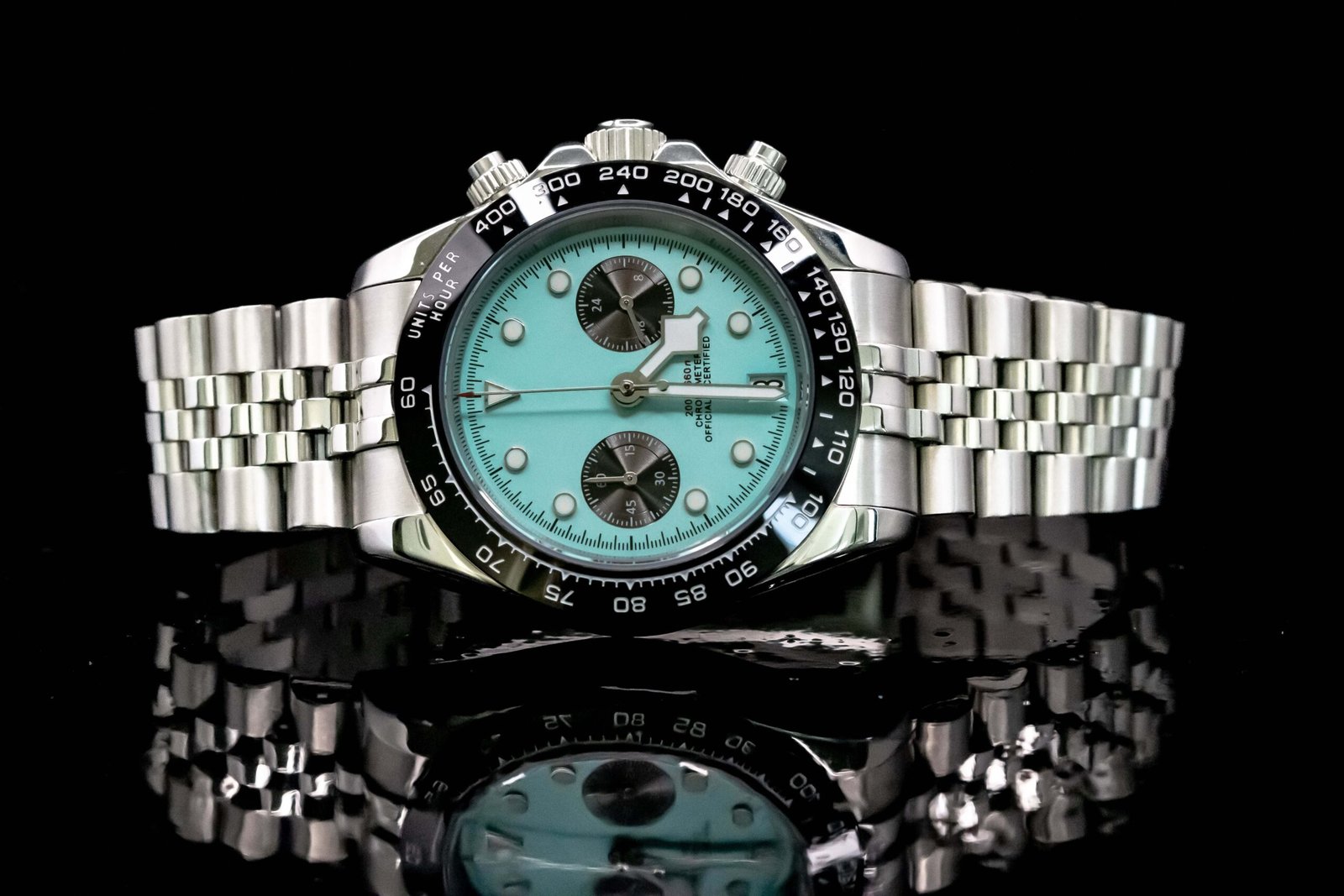 Introducing the baby blue Black Bay Chrono Homage – a classy and sporty timepiece that seamlessly combines elegance and functionality. This stunning watch is perfect for those who appreciate a bold statement piece that doesn’t break the bank. The sleek black bezel and baby blue dial make for a truly unique and eye-catching design, while the chronograph feature adds a practical element for everyday wear. Whether you’re dressing up for a special occasion or heading to the gym, the Black Bay Chrono Homage is the perfect accessory to elevate your look. Get ready to turn heads with this affordable and stylish watch from our collection.