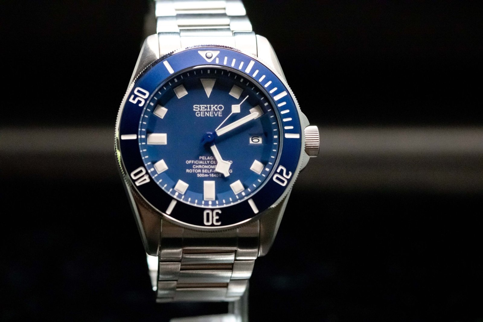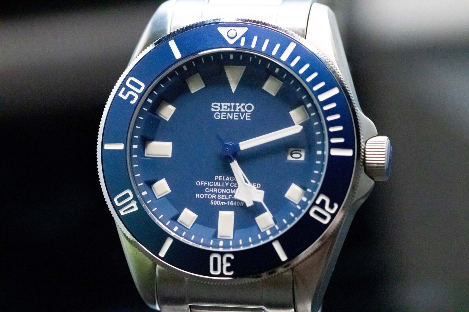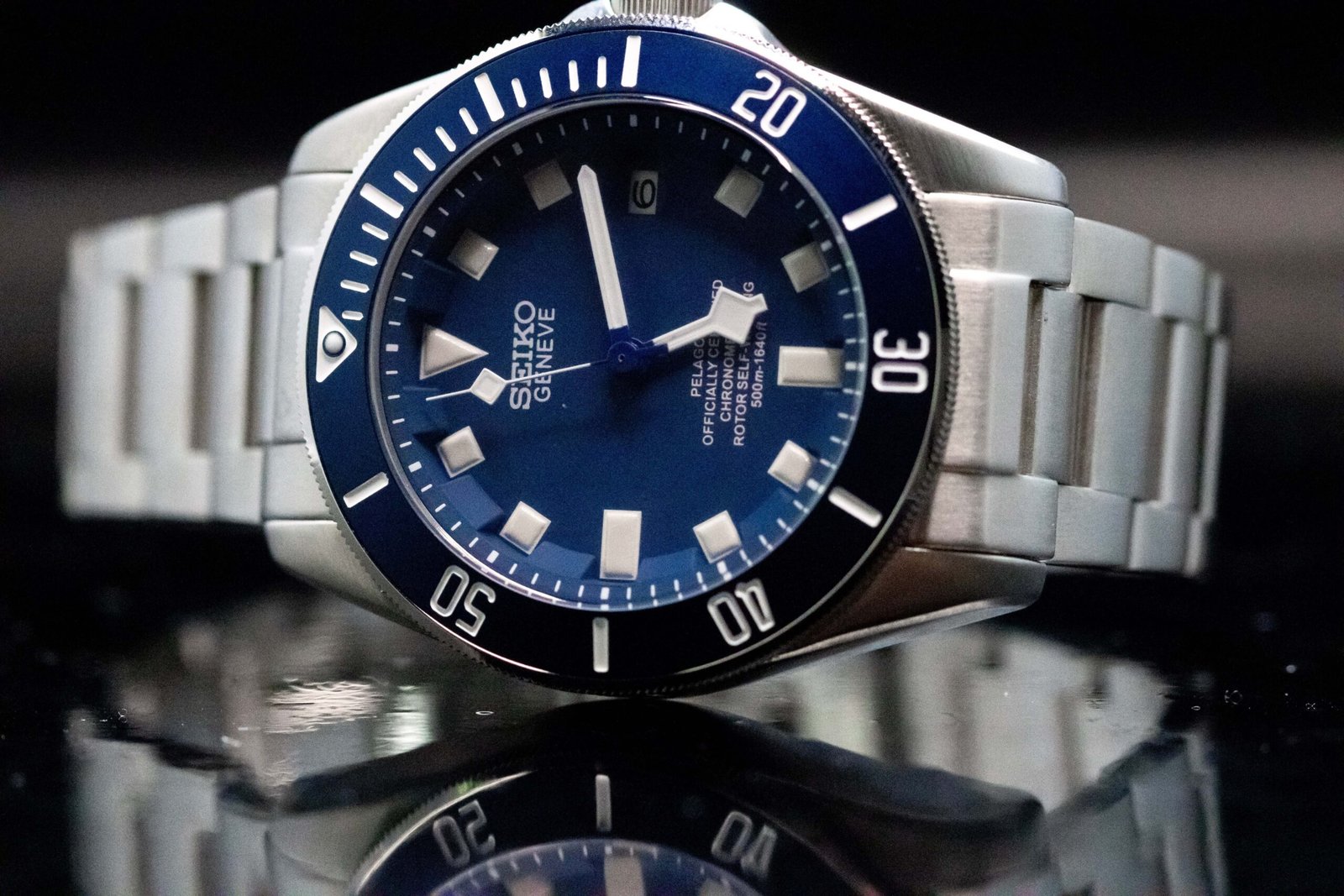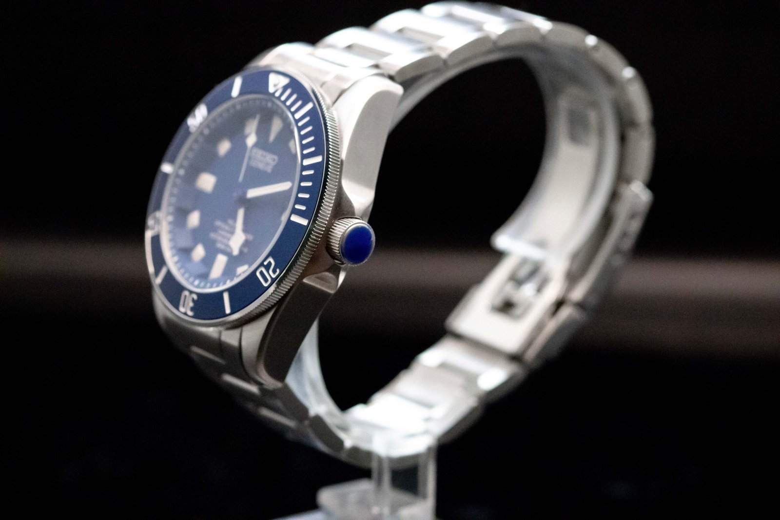 Inspired by the iconic Tudor Pelagos, this custom SeikoMod build pairs bold aesthetics with trusted performance. The deep matte blue dial and matching ceramic bezel exude maritime confidence, while the brushed titanium-style case delivers rugged elegance and lightweight comfort.