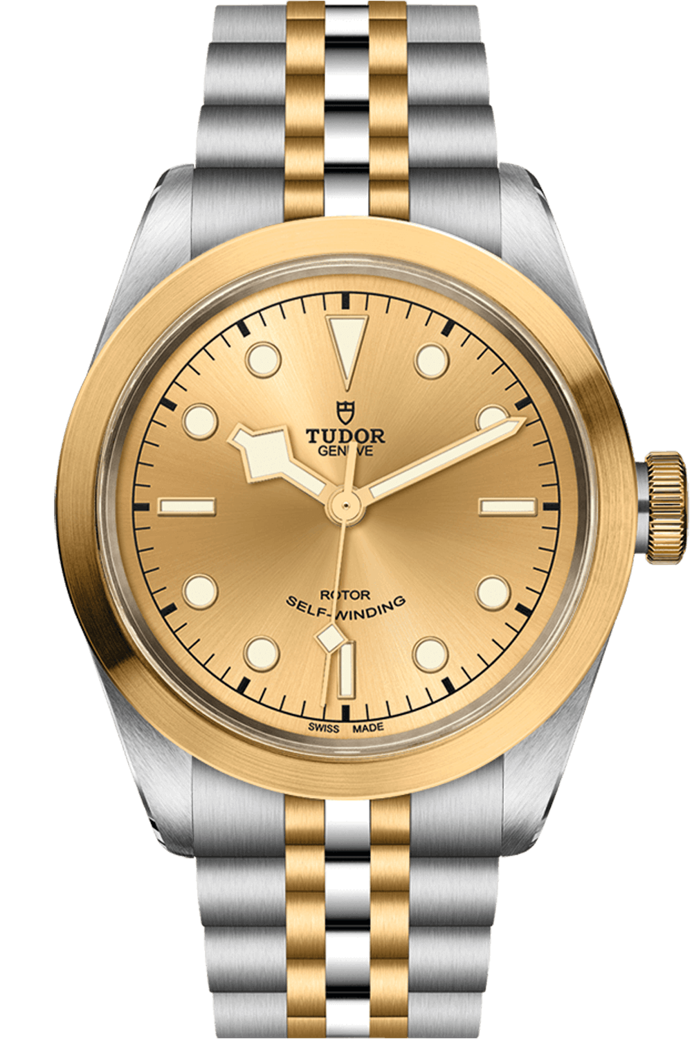 The aesthetic codes emblematic of the Black Bay are represented through a slimmer middle case with a fixed bezel in the Black Bay 41. Named for its 41 mm diameter, this sleek timepiece is fitted with the self-winding TUDOR Manufacture Caliber T601 with a power reserve of approximately 38 hours. With a five-link yellow gold and steel bracelet surrounding a champagne-tone dial, this S&G model elevates your look with a touch of elegance.