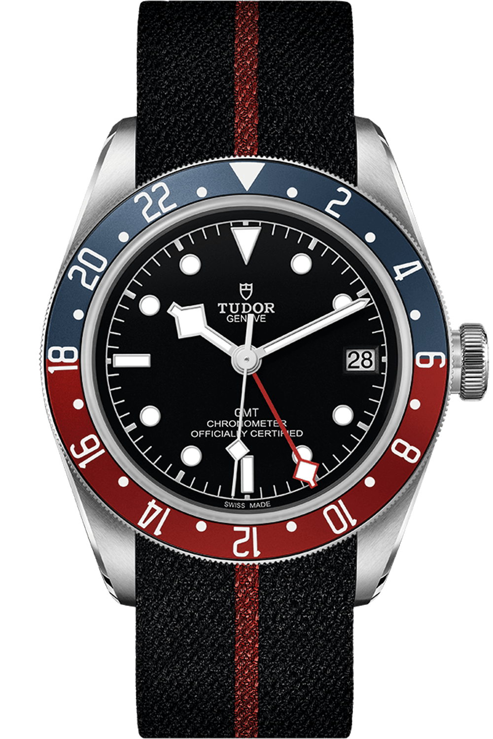 With a bezel in burgundy and blue, this Black Bay GMT lends a new color code to the classic model. It features the same powerful mechanics for which the Black Bay series is known, housed within a 41 mm steel case with a polished and satin finish. This timepiece remains true to TUDOR heritage with hallmark designs such as angular Snowflake hands and an unprotected winding crown.