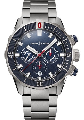 44 mm titanium case, blue dial, Caliber UN-150 self-winding movement with chronograph, approximately 48 hours of power reserve, steel bracelet, folding buckle. Water resistant to 300 m.