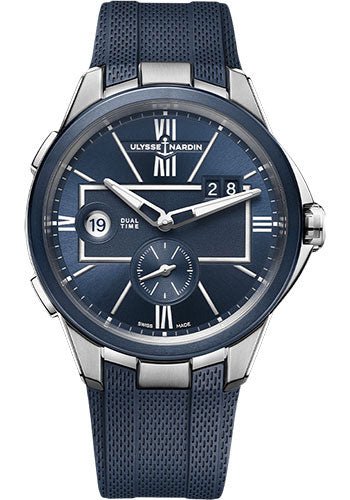 42 mm stainless steel case, blue dial, Caliber UN-24 self-winding movement with second time zone quick setting, approximately 42 hours of power reserve, rubber strap, pin buckle. Water resistant to 50 m.