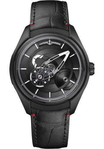 43 mm titanium case, black dial, Caliber UN-230 self-winding movement, approximately 72 hours of power reserve, leather strap, DLC folding buckle. Water resistant to 50 m.